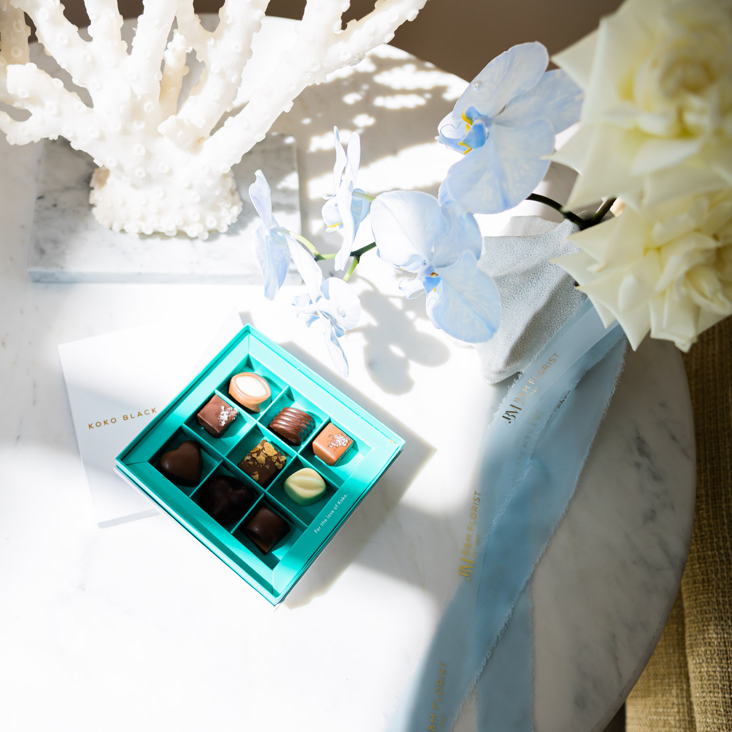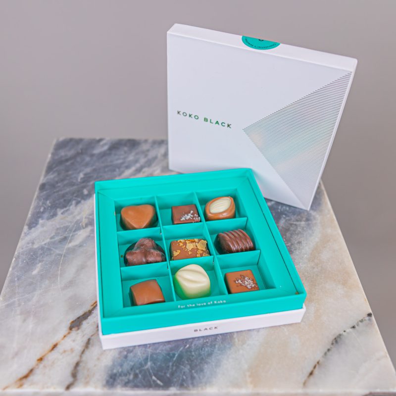 A nine piece assortment of Koko’s most loved pralines. Including a selection of white, milk and dark chocolate.