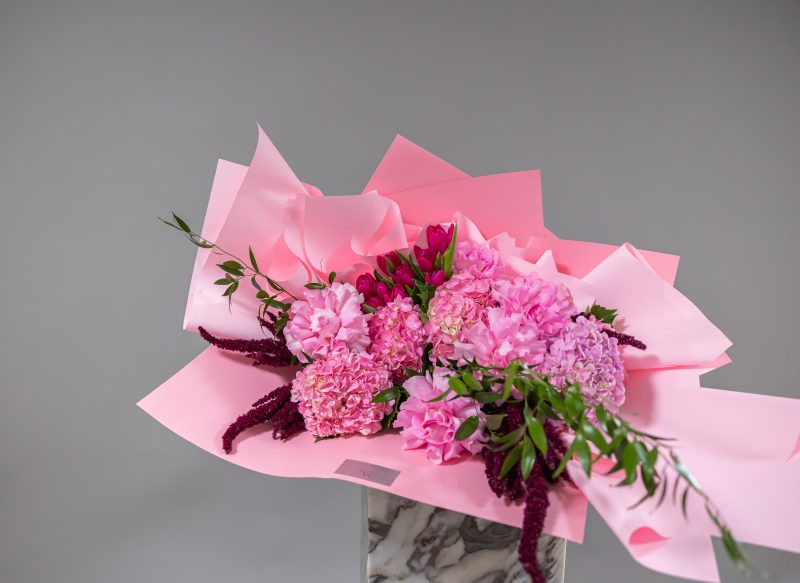 Featuring premium blooms of reflexed roses, elegant tulips, lush hydrangea, and striking amaranthus, this bouquet is a statement of bold femininity. The reflexed roses create dramatic depth and dimension, while tulips add graceful fluidity. Hydrangea introduces softness and volume, balanced by the cascading texture of amaranthus for a contemporary finish.