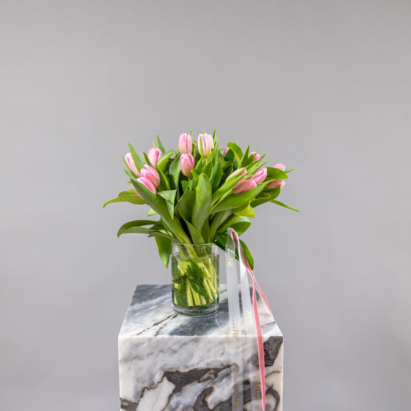 Featuring 20 premium stems of tulips, each bloom is selected for its graceful form and vibrant presence. The tulips are styled to move naturally, creating a soft, organic silhouette that feels both modern and timeless.