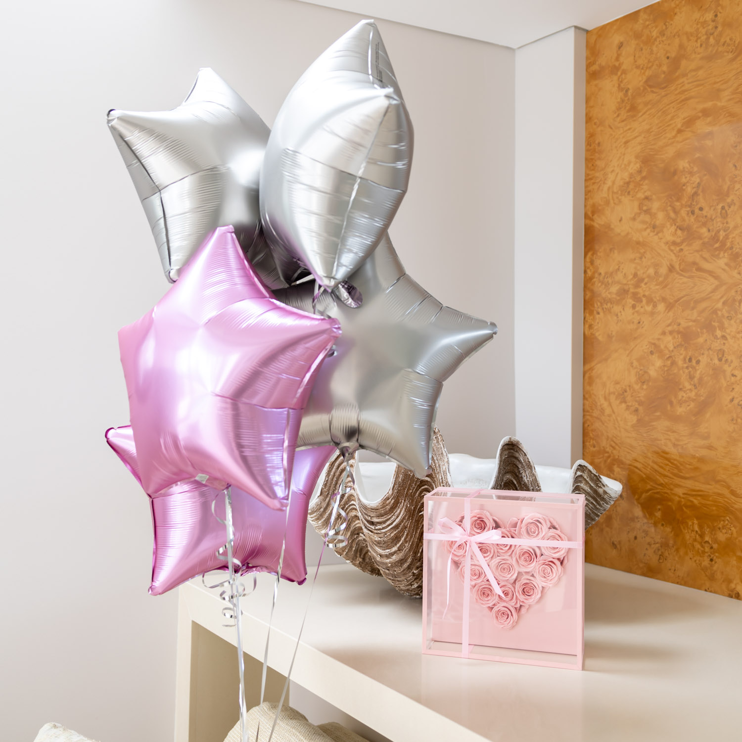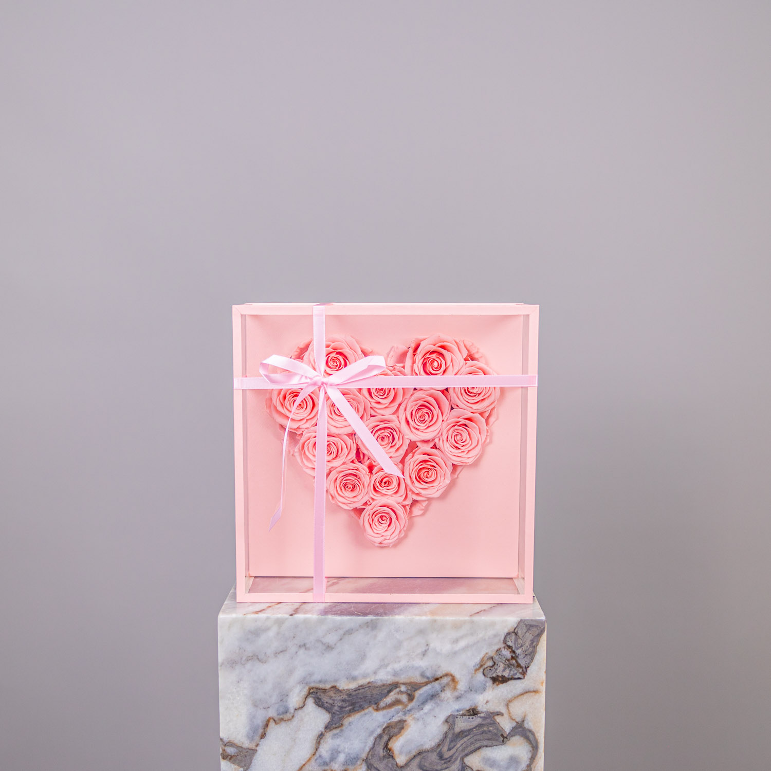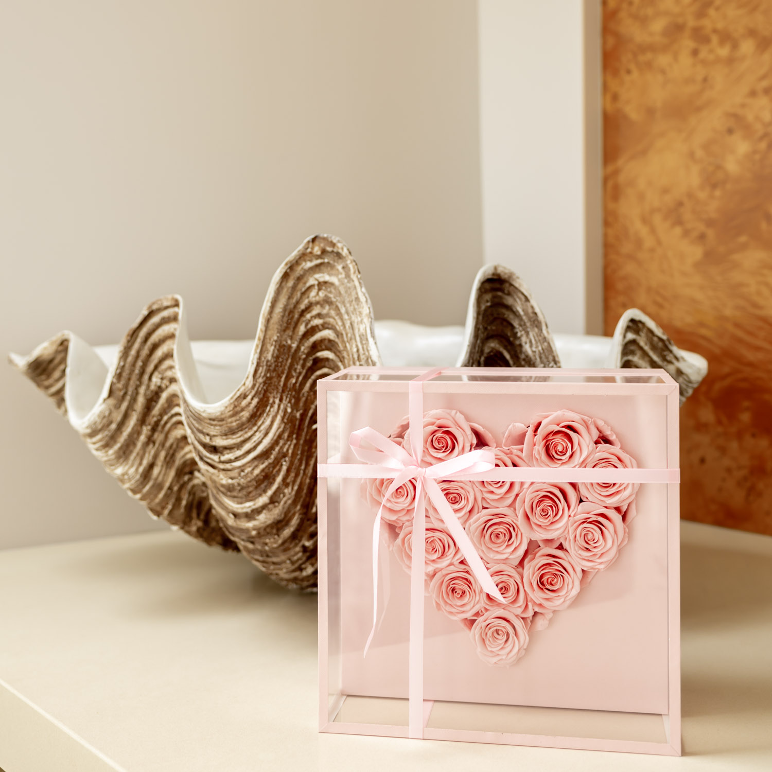 Fourteen everlasting roses are carefully arranged in a sculptural heart form, each bloom preserved to maintain its softness, colour, and delicate structure over time. Their gentle blush tones create a sense of warmth and tenderness, while the heart silhouette brings a refined, emotive presence.