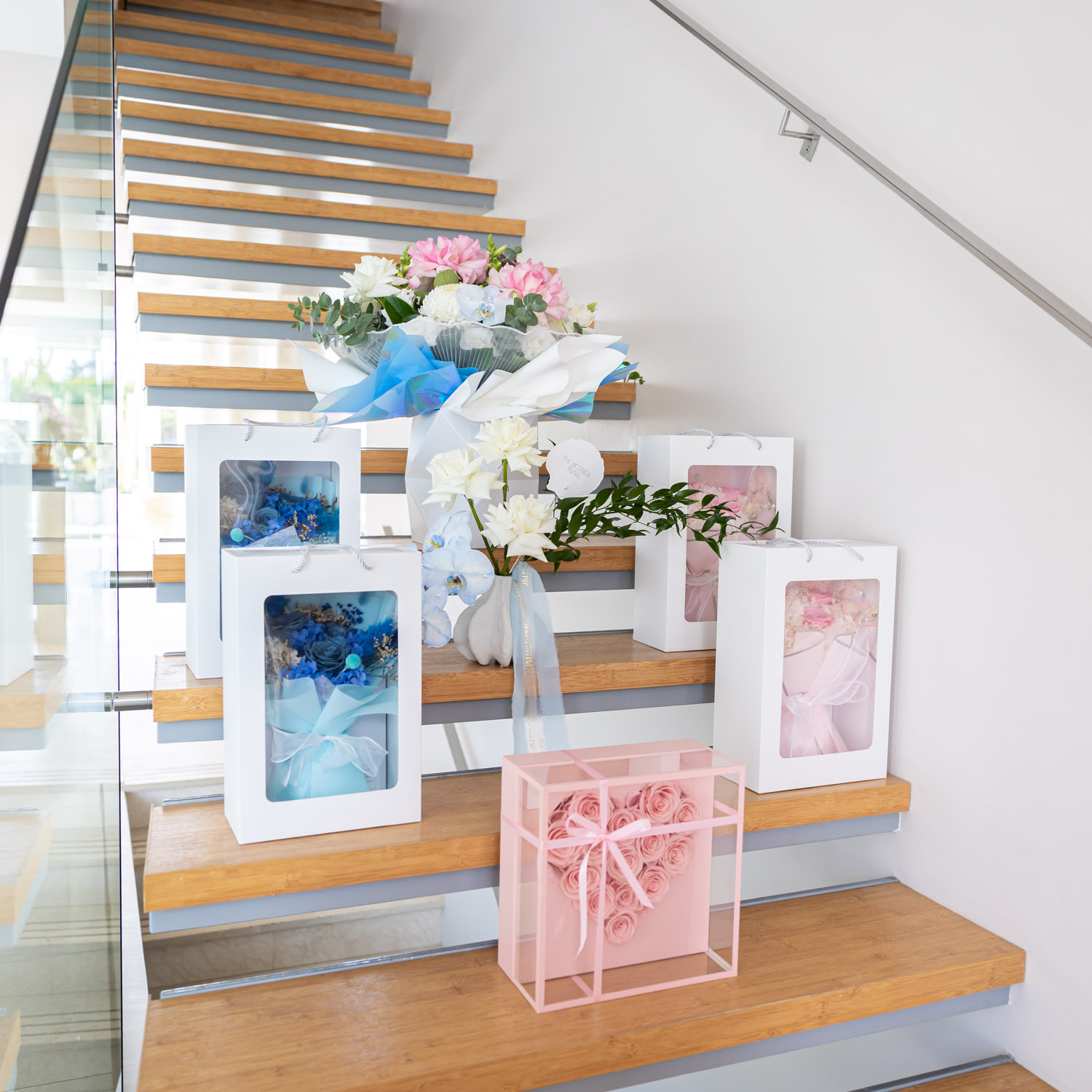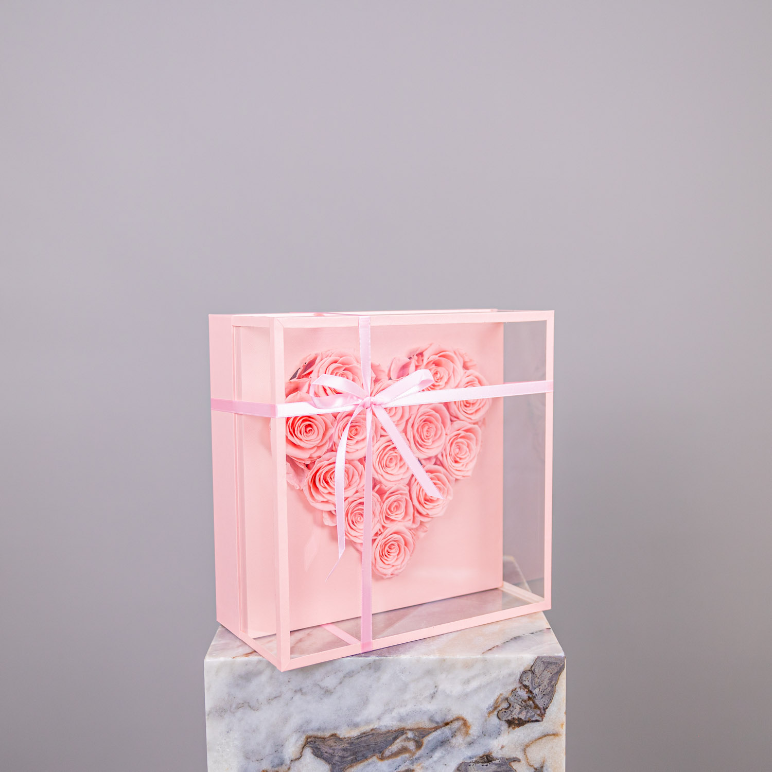 Encased within a clear, structured display box with a sleek, glass-like finish, the design feels modern, elevated, and gift-ready—allowing the arrangement to be admired from every angle while remaining protected.