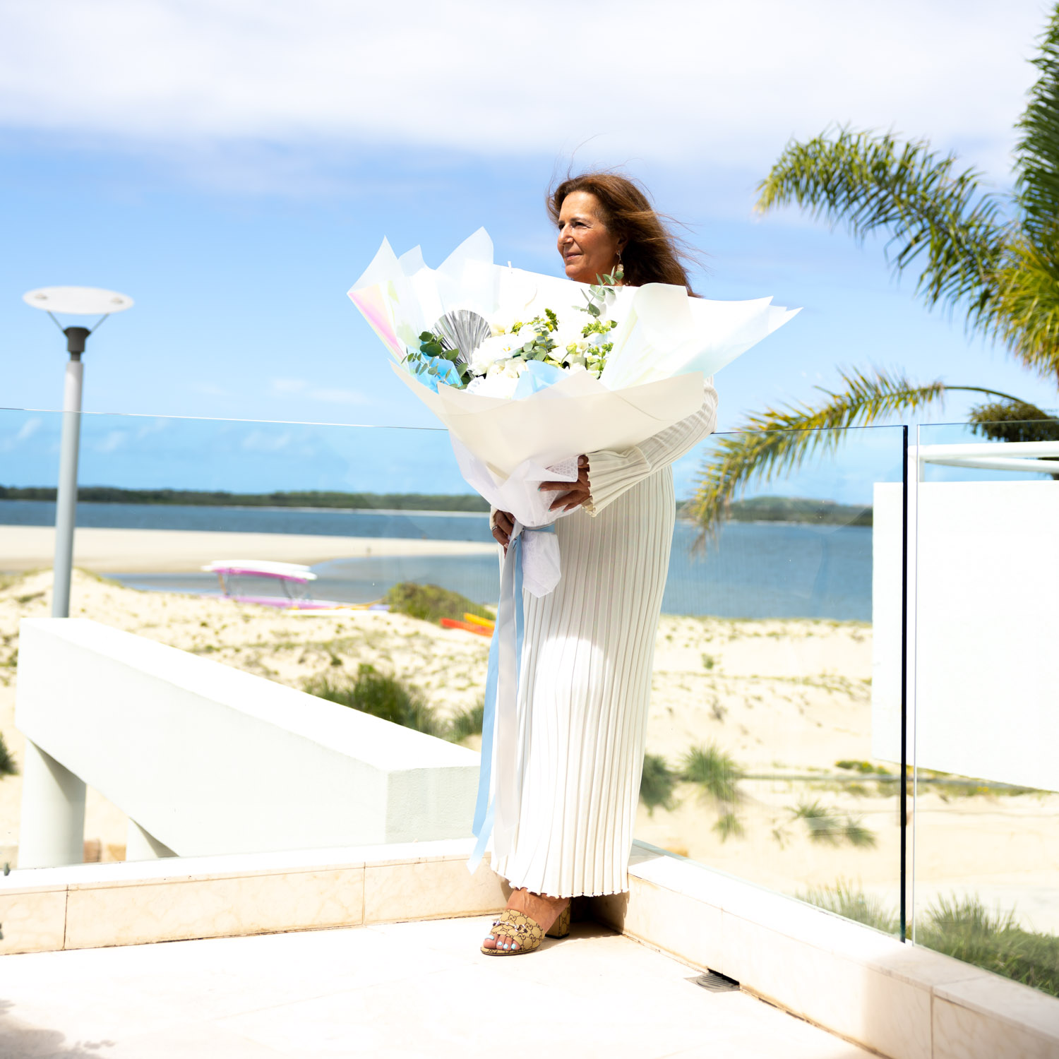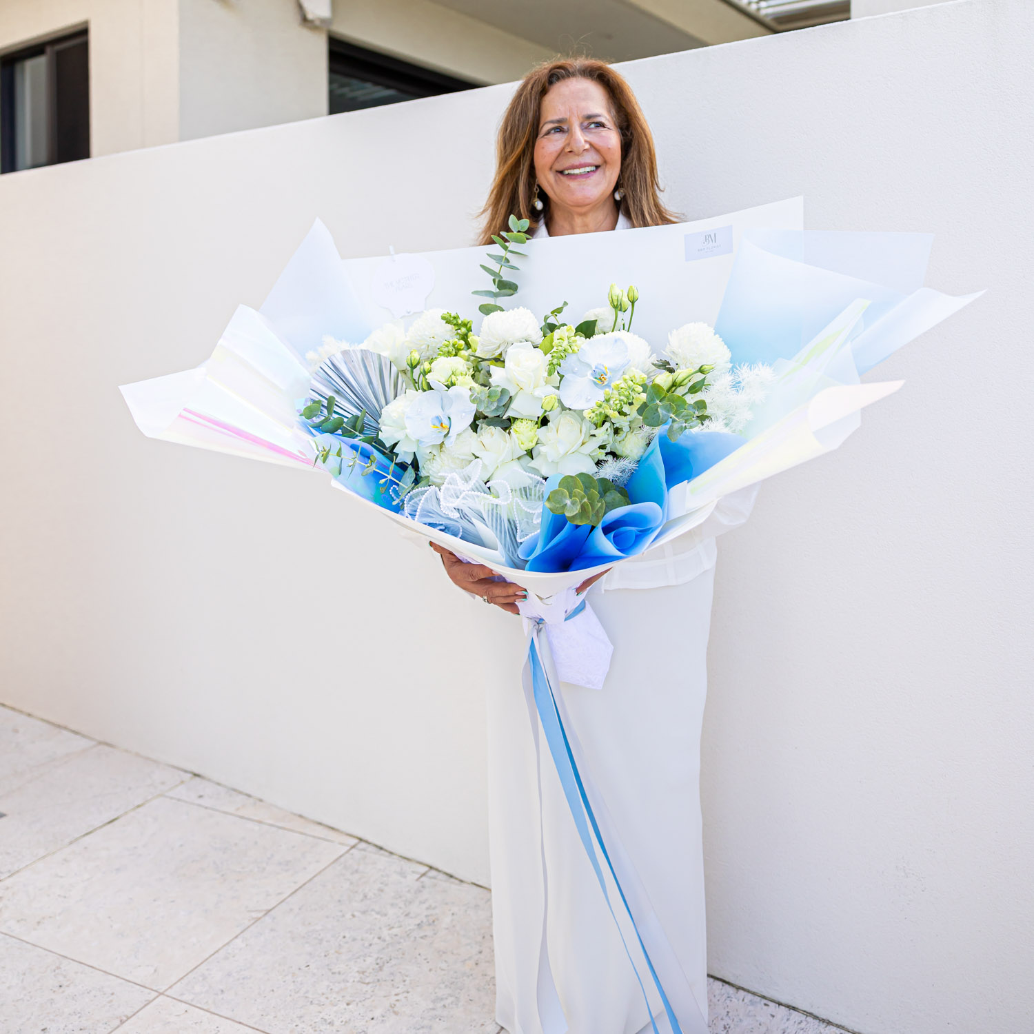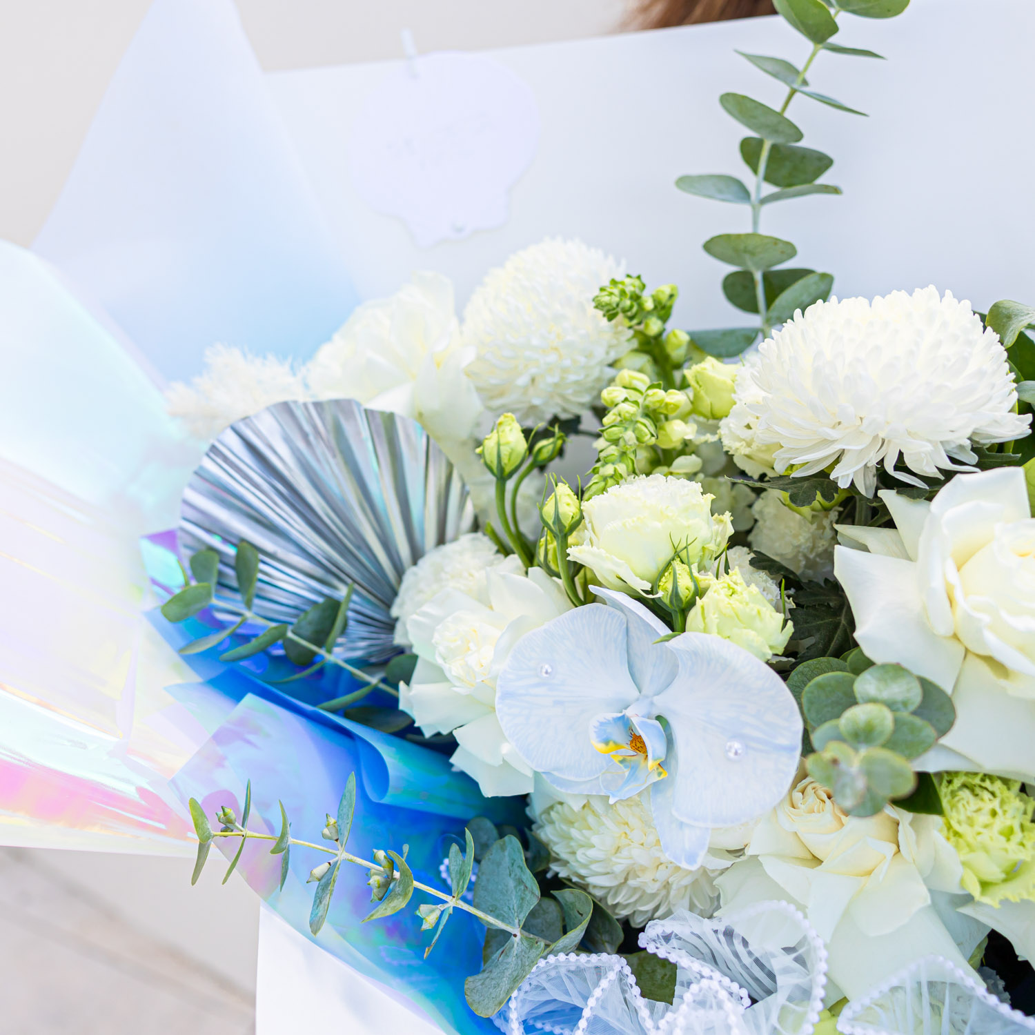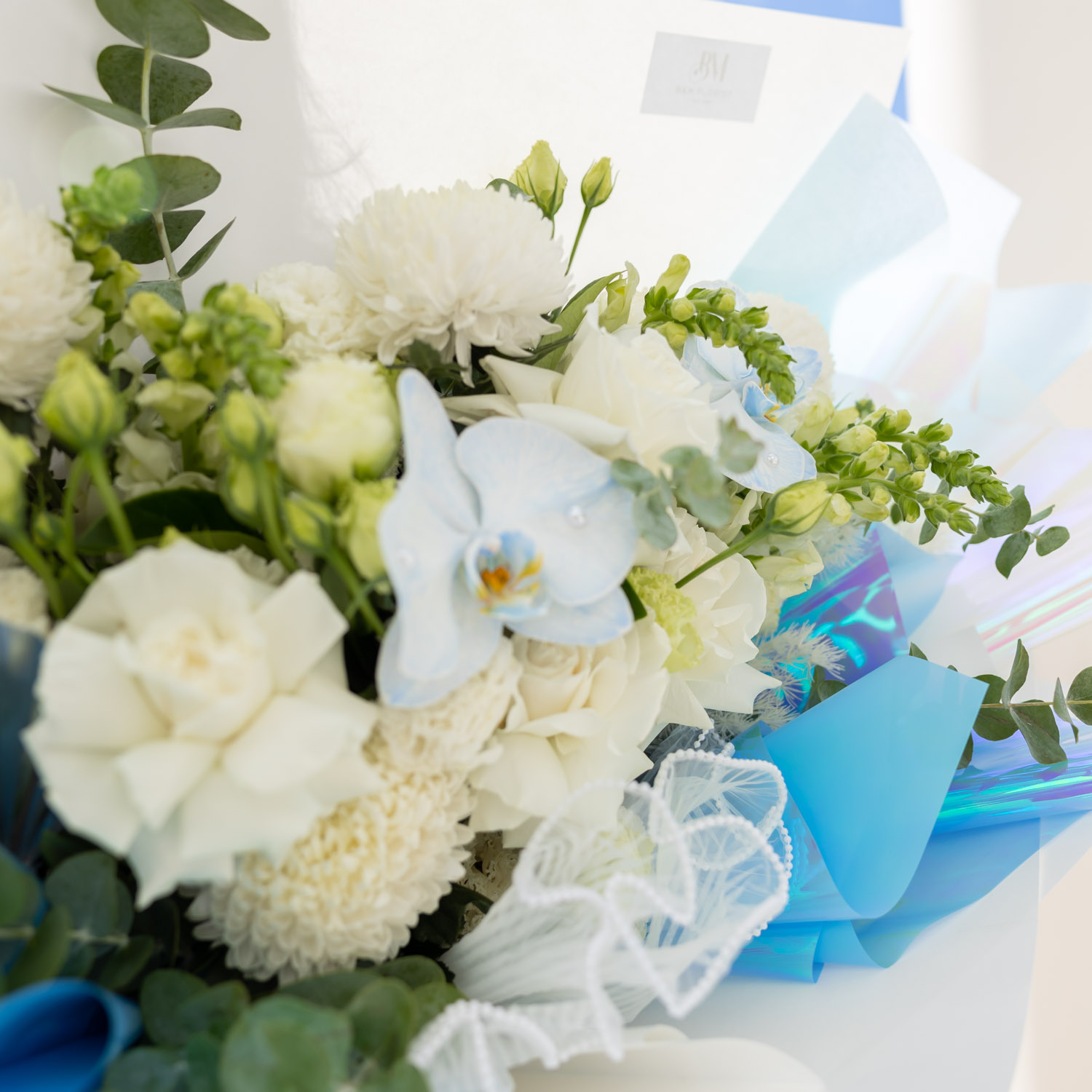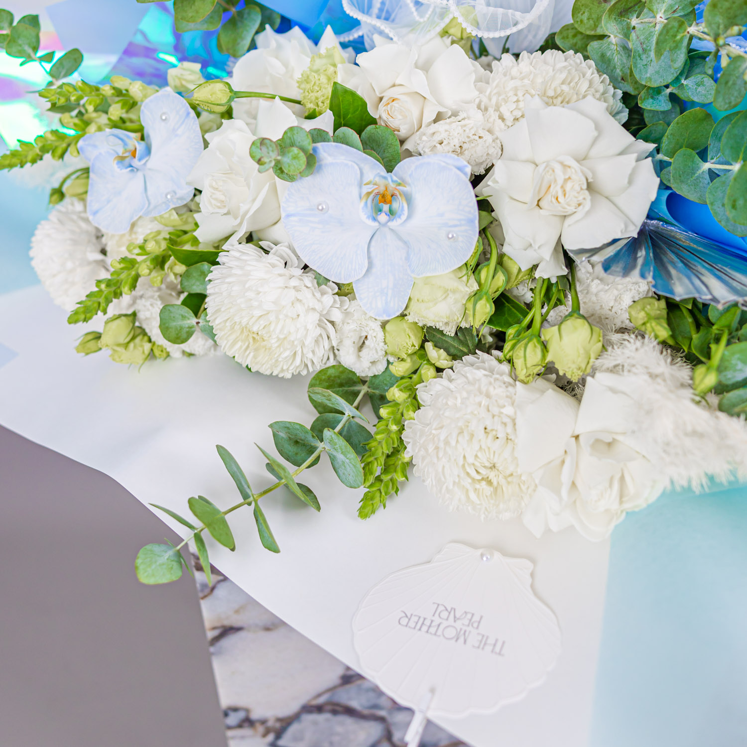 At its centre, delicate white blooms are paired with soft blue accents and fresh greenery, creating a palette that feels airy and refined. Sculptural elements of silver palm introduce a modern edge—adding texture and form while enhancing the layered composition.