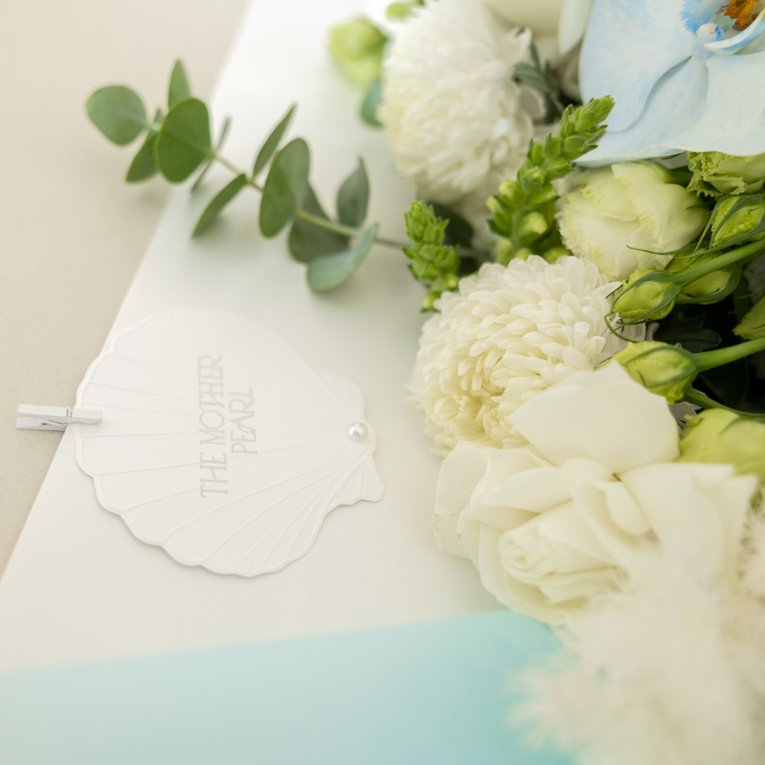 Finished with an embossed cut-out shell, delicately adorned with a pearl—an elegant nod to the Mother Pearl.