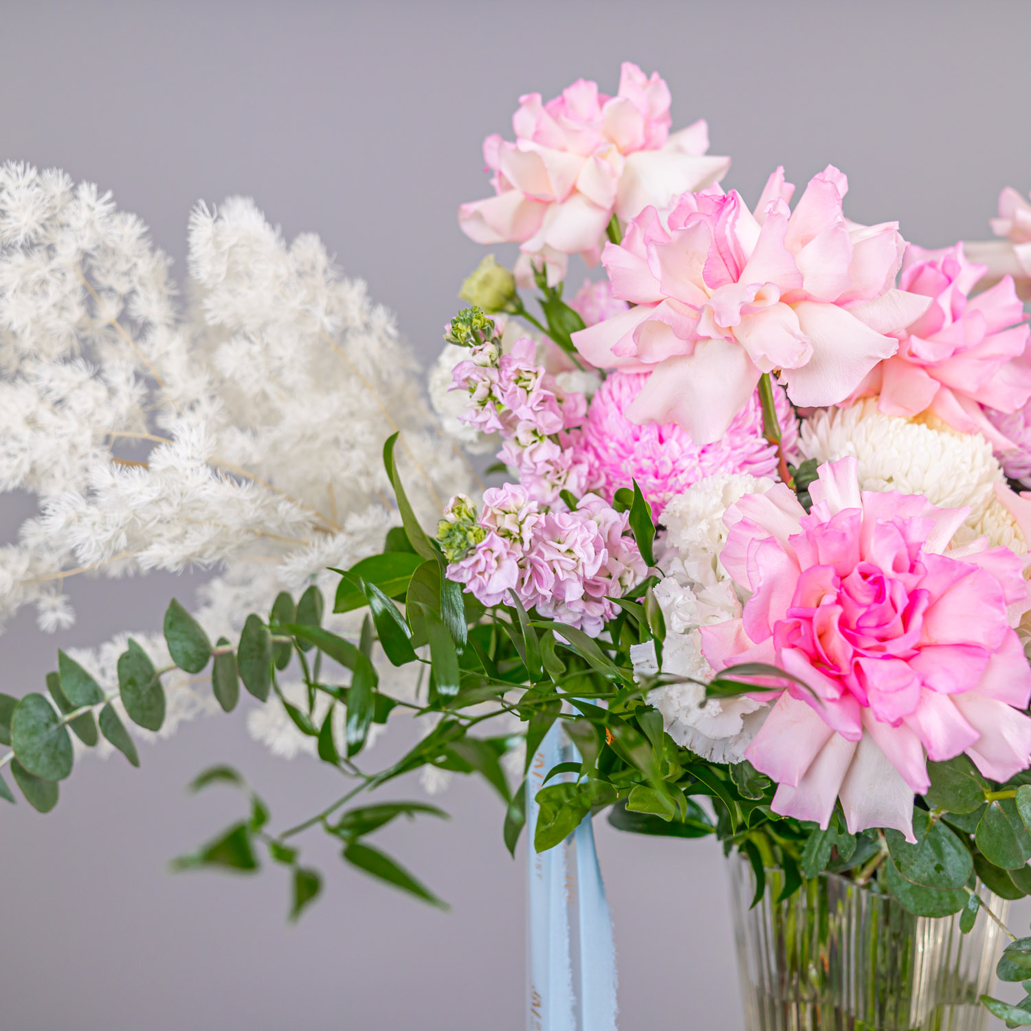 Set within a fluted glass vase, the design reveals each stem with clarity and intention, allowing the composition to feel open, layered, and alive. Its transparency mirrors the purity of a pearl—formed slowly, with depth and quiet strength.
