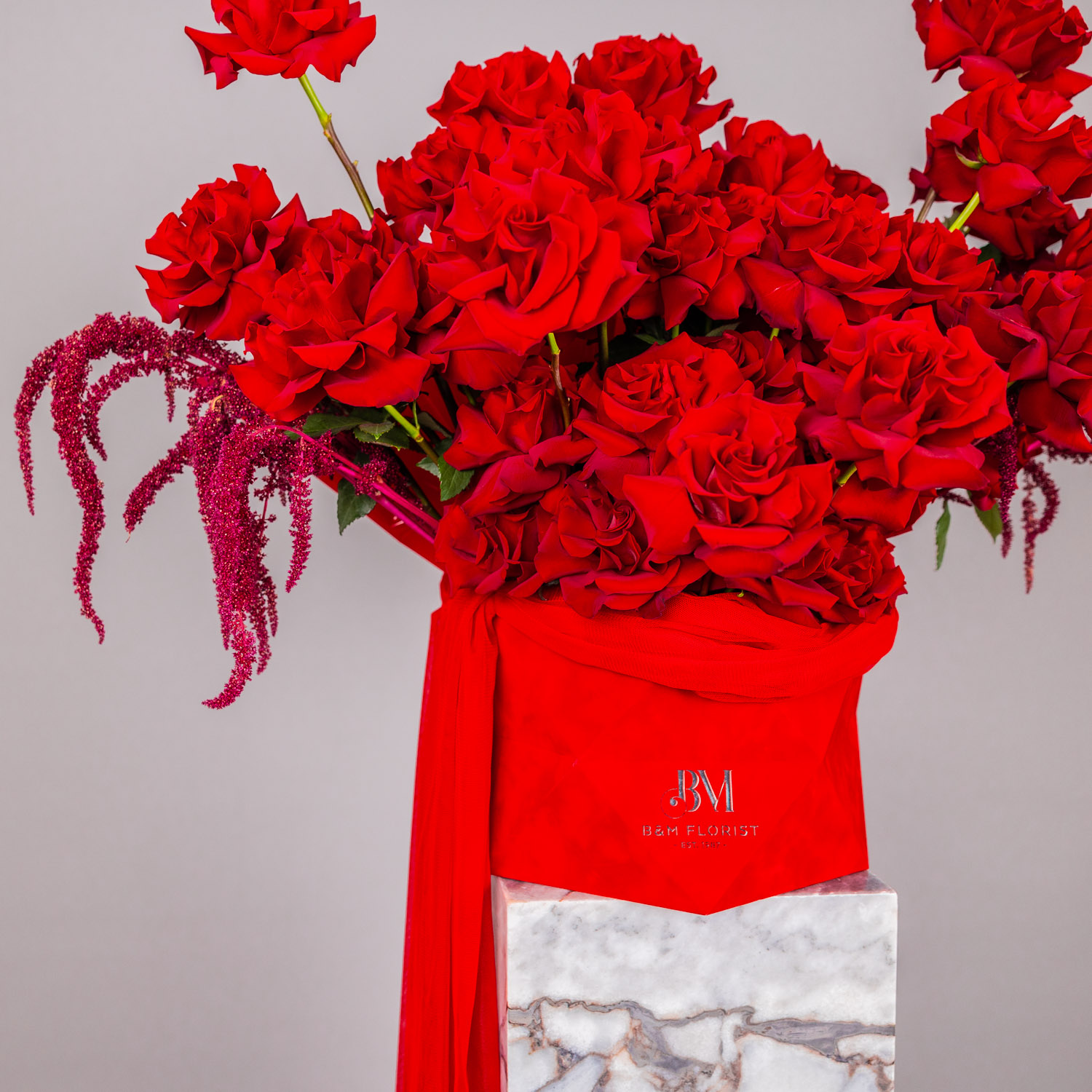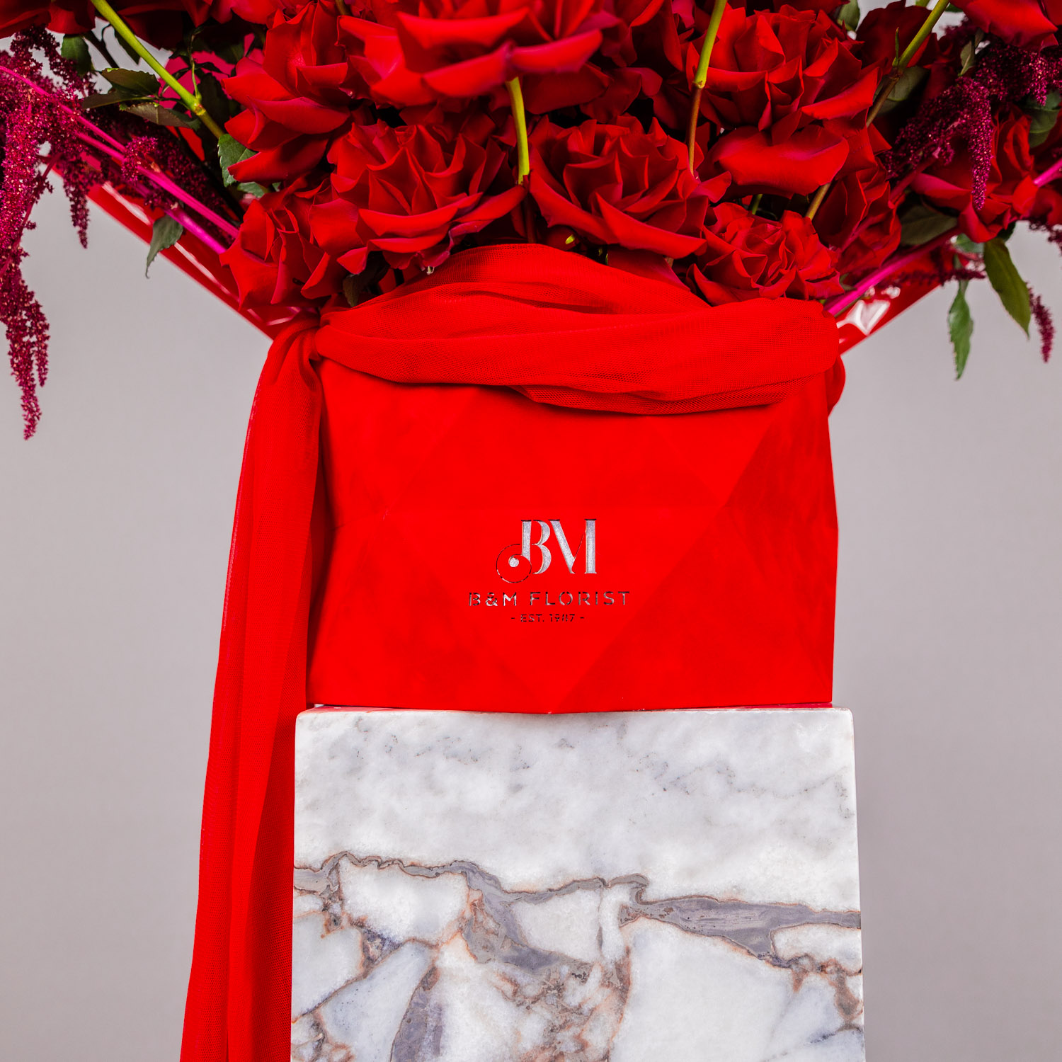 Presented in our custom-made velvet flower box, this design is exclusive to B & M Florist. The box features a distinctive geometric silhouette, wrapped in plush red velvet for a soft, tactile finish that invites touch. Rich in colour and architectural in form, it brings depth, warmth, and unmistakable presence to the arrangement.