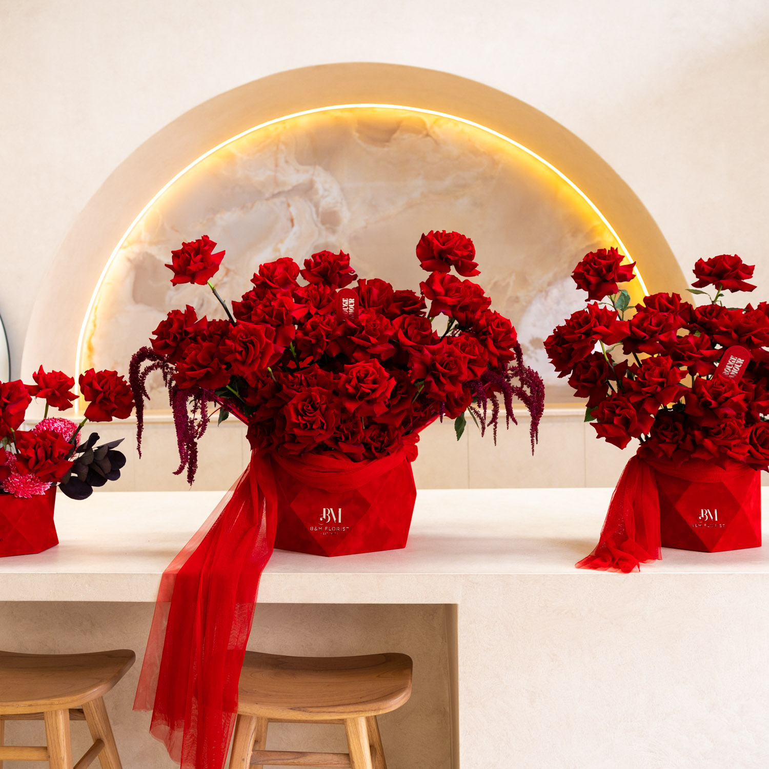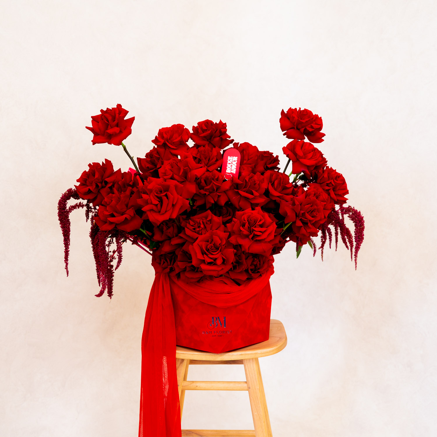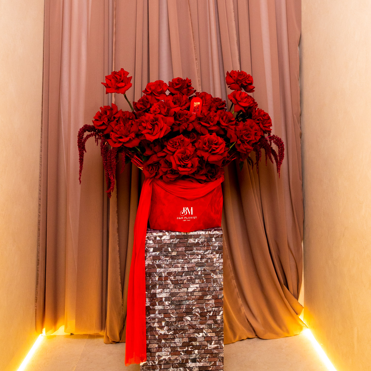 The pinnacle of the Rouge Amour Valentine’s Day Collection, this arrangement features 40 reflexed red roses, delicately reflexed by hand to create a fuller, sculptural silhouette this exclusive velvet flower box offers dramatic volume and sculptural beauty. Designed for luxury Valentine’s gifting, it embodies the refined passion of the Rouge Amour Collection.